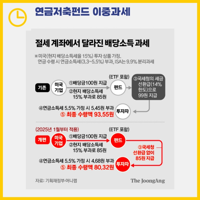 그런데 문제는 해외 배당 ETF 같은 상품에 투자할 때 발생했다. 예를 들어, 미국 배당 ETF에서 배당이 발생하면 미국에서 이미 15%의 세금을 떼고 들어온다. 과거에는 국세청이 이 세금을 ‘선환급’ 방식으로 보전해 줘서 계좌에는 세전 금액이 그대로 들어왔고, 덕분에 전액을 재투자할 수 있었다.