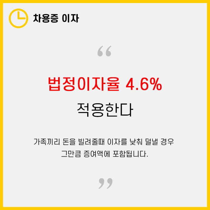 따라서 가족끼리의 차용증 이자로 4.6%를 기입해야 증여세를 내지 않는다는 점 꼭 기억해두시길 바랍니다.