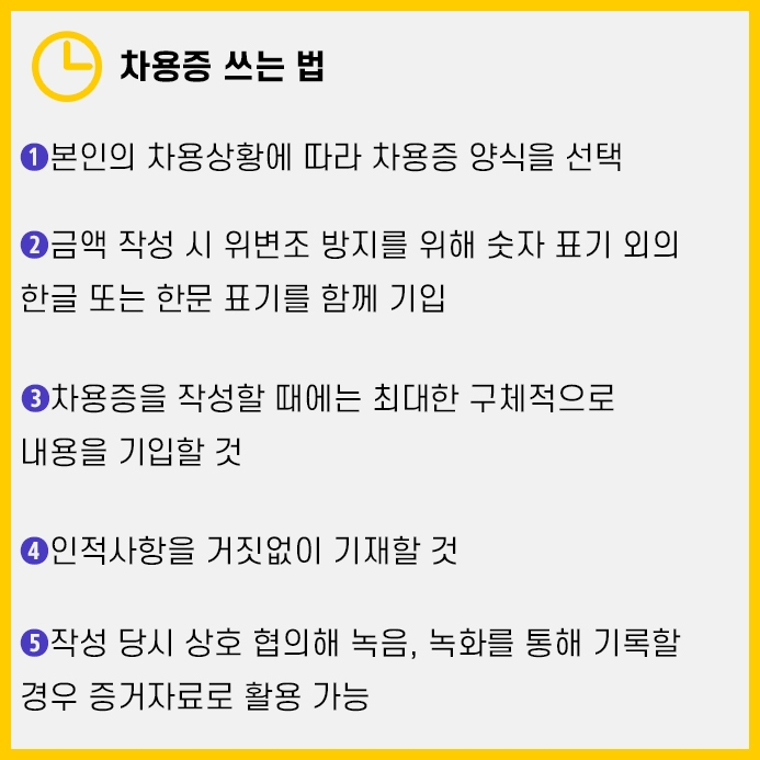 마지막으로 차용증 작성 시 최대한 내용을 구체적으로 기입해 주는 것이 좋습니다.