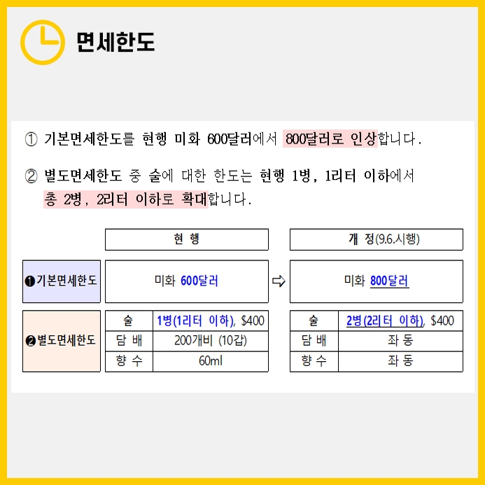 또한 술의 면세한도도 1병(1리터, 400달러 이하)에서 2병(2리터 이하, 400달러 이하)로 변동되었습니다.