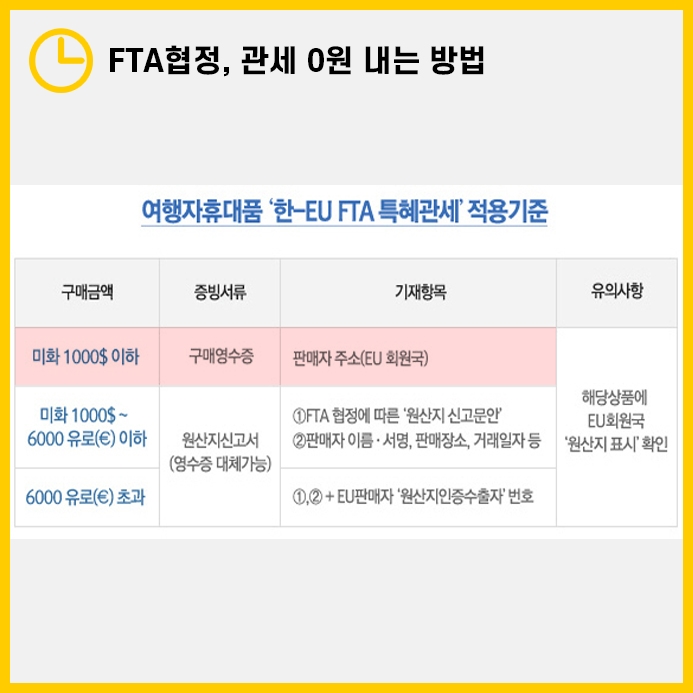 FTA협정은 EU회원국에서 명품백을 구매할 경우 국내 반입 시 특정 정차만 거치면 관세를 납부하지 않는 내용을 포함하고 있습니다.