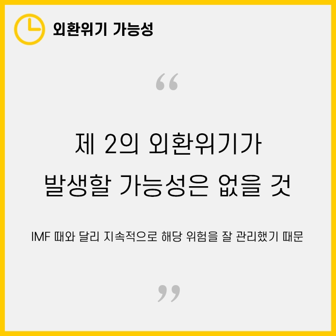 1998년 IMF 사태때와 달리 이번에는 외환보유고를 지속적으로 늘려오는 등 리스크 관리를 해왔기 때문입니다.