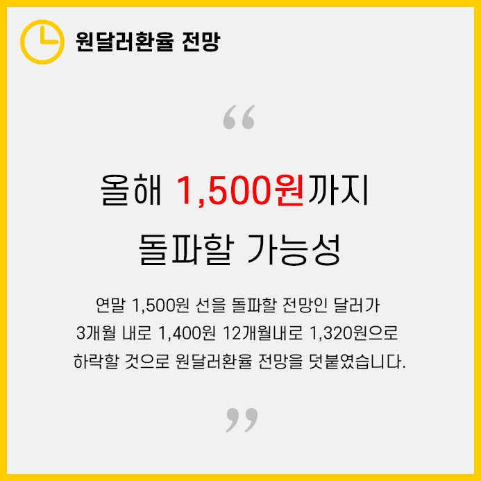 타이 후이 JP모건자산운용 수석전략가에 의하면 원달러환율 전망으로 올해 1,500원까지 돌파할 가능성을 제시했습니다.