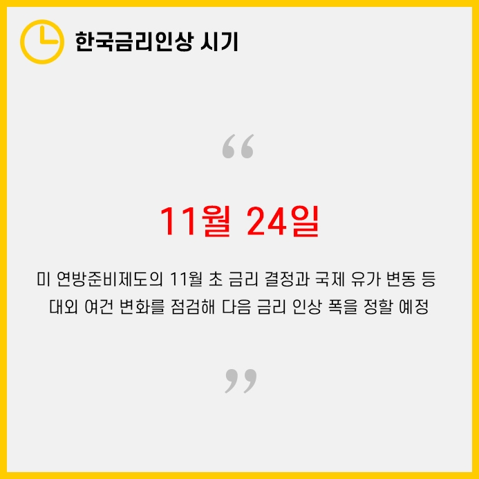 다음번 11월에 올 한국금리인상 시기는 11월 24일로 이 때 역시 빅스텝 전망이 우세합니다.