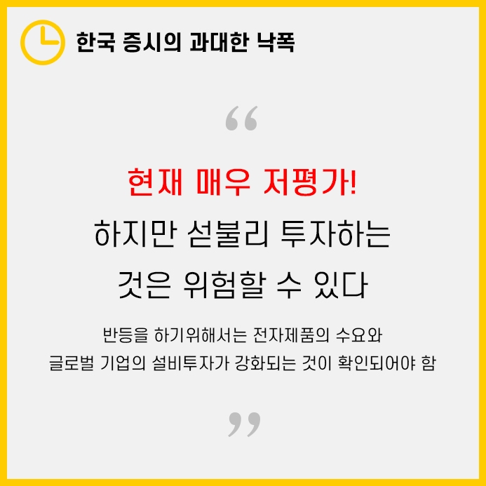 이에 따라 수석전략가는 한국증시가 저평가된 상태긴하지만, 반등을 위해서는 수요와 글로벌 기업의 설비투자 강화가 선행되어야함을 강조했습니다.