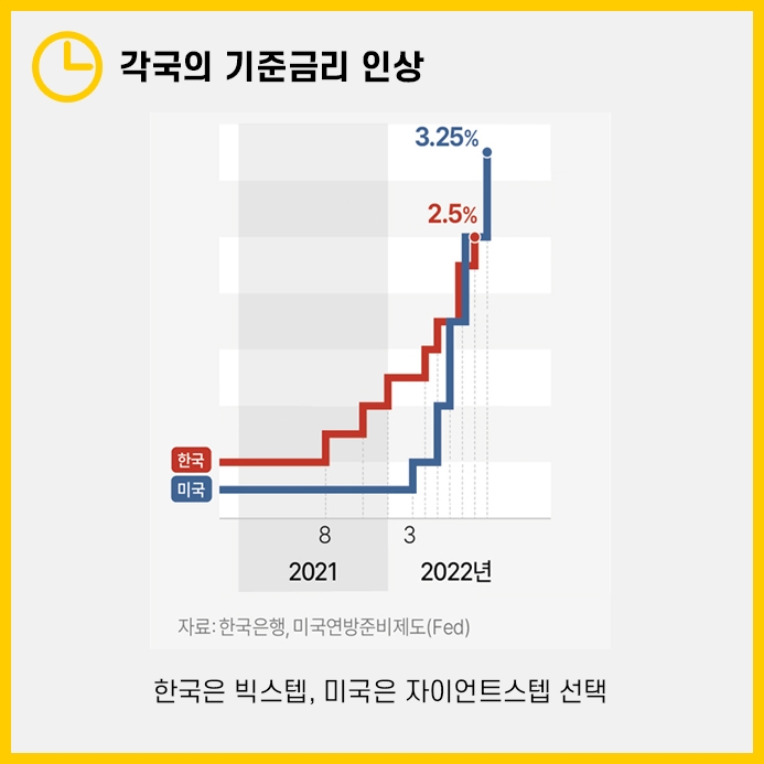 한국은 이에따라 기준금리를 0.5%올린 빅스텝을 택하고, 캐나다와 스웨덴은 1.0% 올려 울트라스텝을 택했습니다.