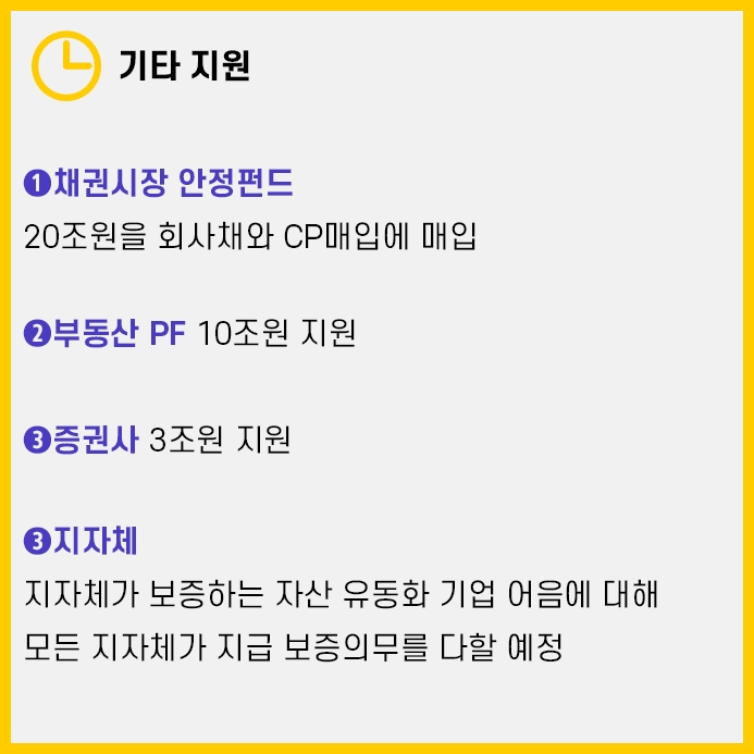 이 밖에도 시장에 유동성을 공급하고자 증권사에 3조원, 부동산 PF지원을 위해 10조원의 예산을 책정했습니다.