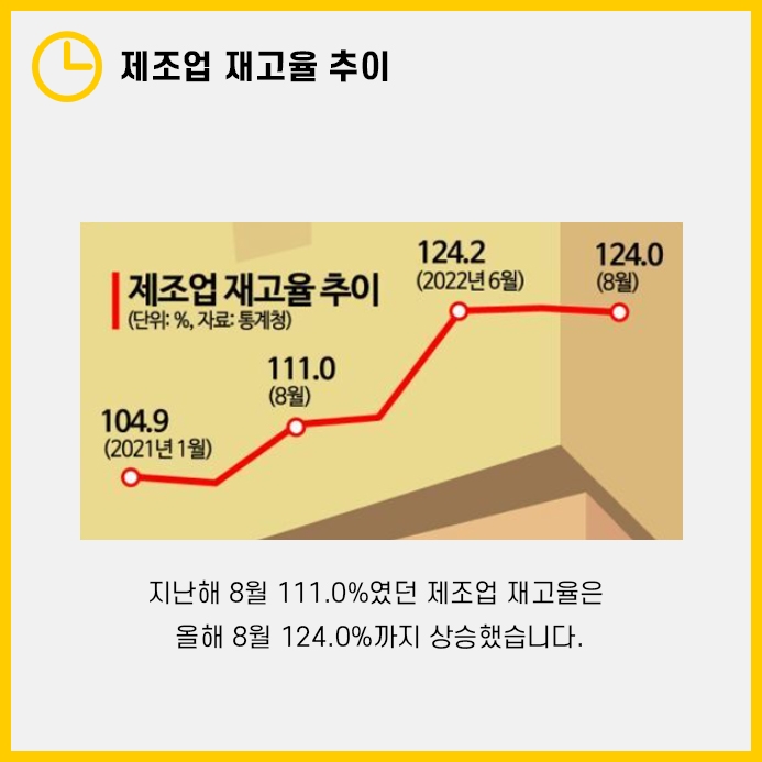 지난해 8월 111.0%였던 제조업 재고율이 올해 8월에는 무려 124.0%으로 급상승을 하게되었는데요.