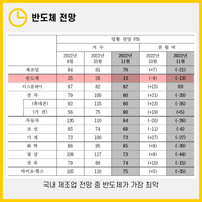 이중에서 반도체는 2022년 11월 PSI가 13으로 최악의 전망을 보였습니다.