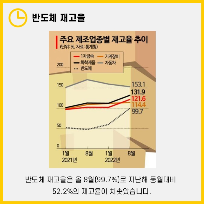 최근 반도체 재고율(99.7%)이 작년 동월 대비 52.2%나 치솟았다는 것이 문제입니다.