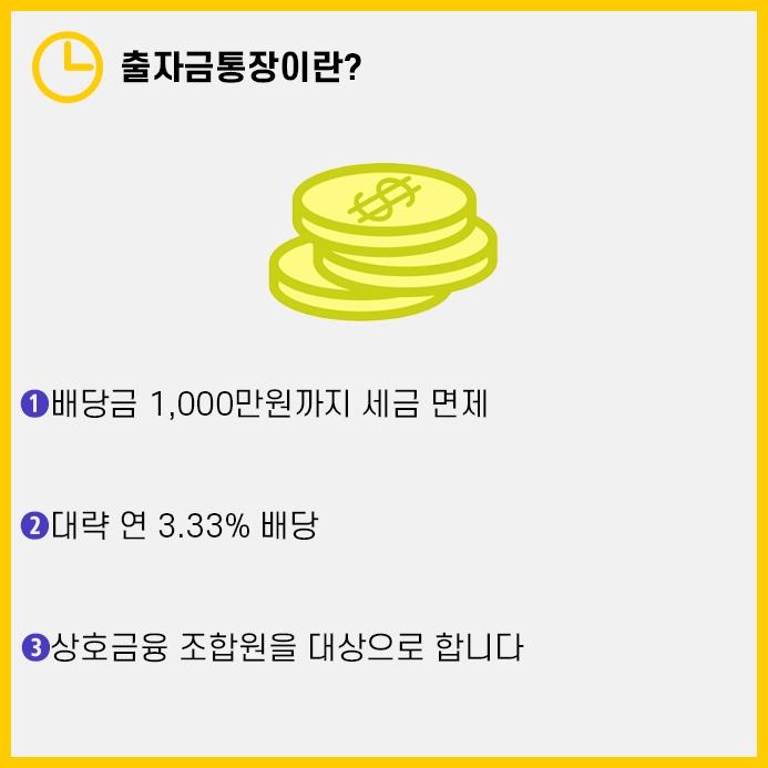 출자금통장은 해당지점의 조합에 가입할경우 배당금을 지급하는 금융상품입니다.
